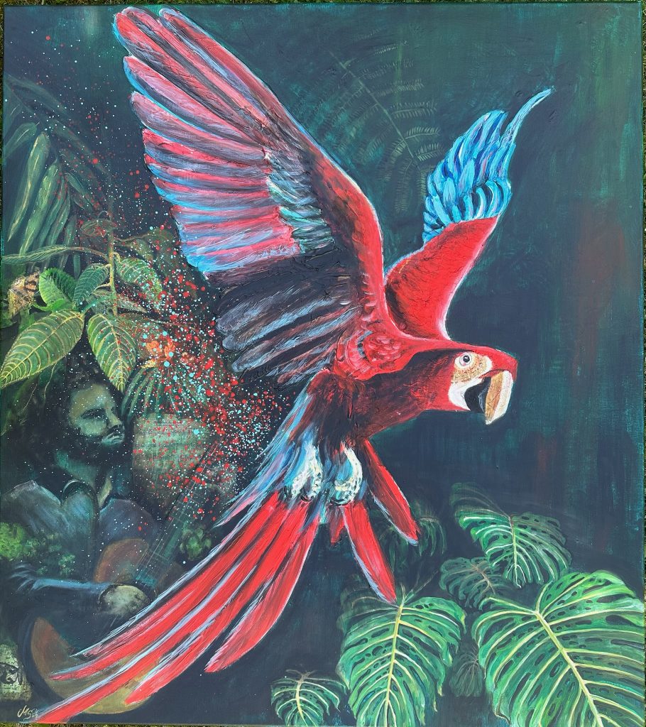 The painting The Parrot That Cannot Be Caught reflects the vibrant life of a musician with Brazilian temperament — someone who cannot be held down, who never lets himself be defeated. Like a colorful parrot in flight, he follows his own path, finding meaning in music and in nature. His spirit remains free, resilient, and full of life.