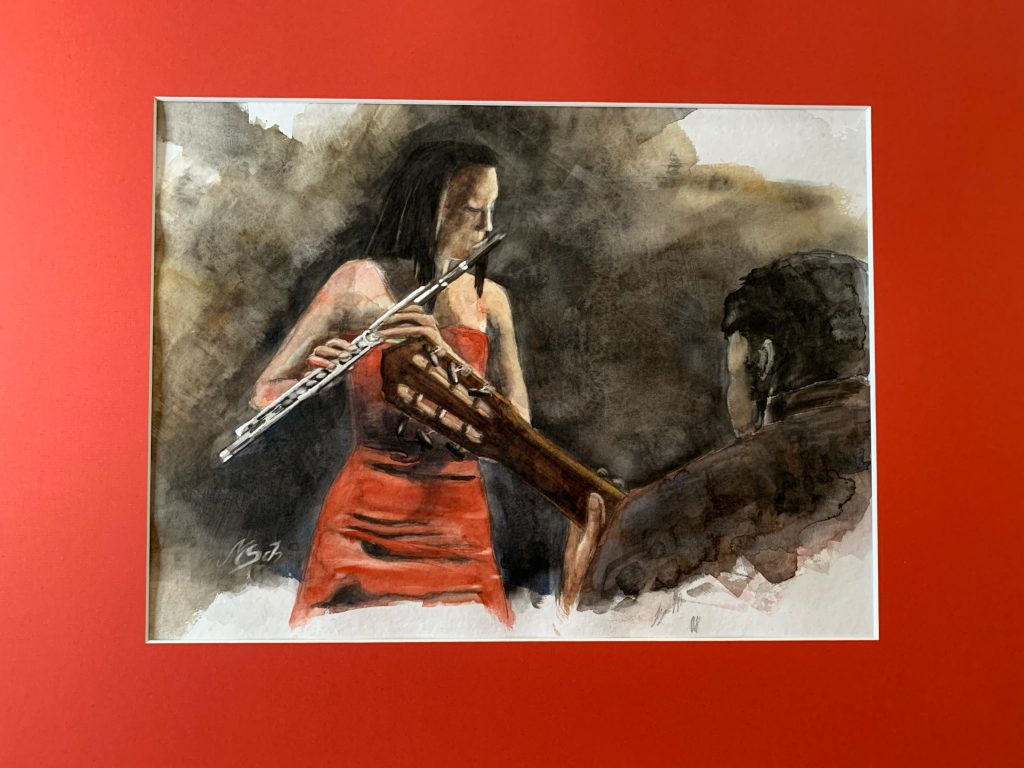 The next painting in my music series focuses on the flute. „Flute at the Concert“ portrays a flutist performing together with a guitarist. The moment is inspired by a concert in which they might have played Café 1930 by Astor Piazzolla — a piece filled with tenderness, quiet longing, and subtle rhythmic tension. In this watercolor, I wanted to capture the intimate dialogue between flute and guitar, their voices blending into a soft, nostalgic atmosphere.