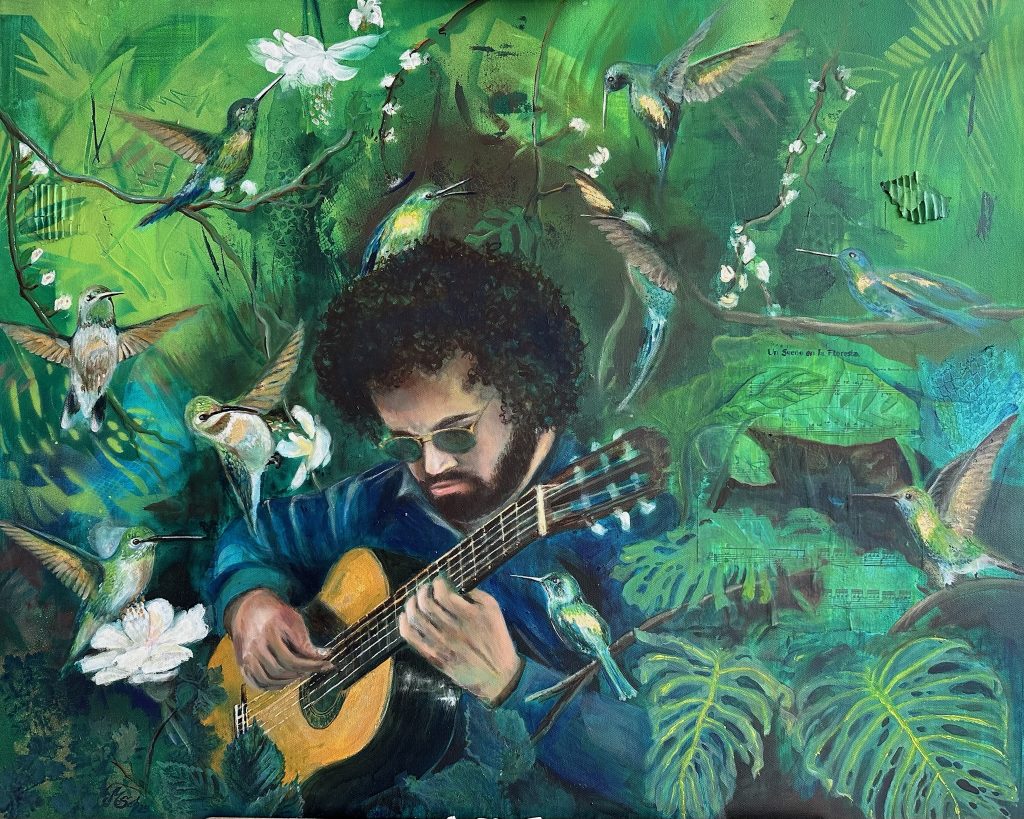 The next painting in my music series is inspired by Garoto’s Un Sueño en la Floresta. In this work, the guitarist Pedro sits virtually in the rainforest, surrounded by nature. The hummingbirds symbolize the rapid, delicate movement of his fingers on the strings. Music and nature are in perfect harmony — the dreamlike atmosphere of the forest merging with the lyrical beauty of the guitar.